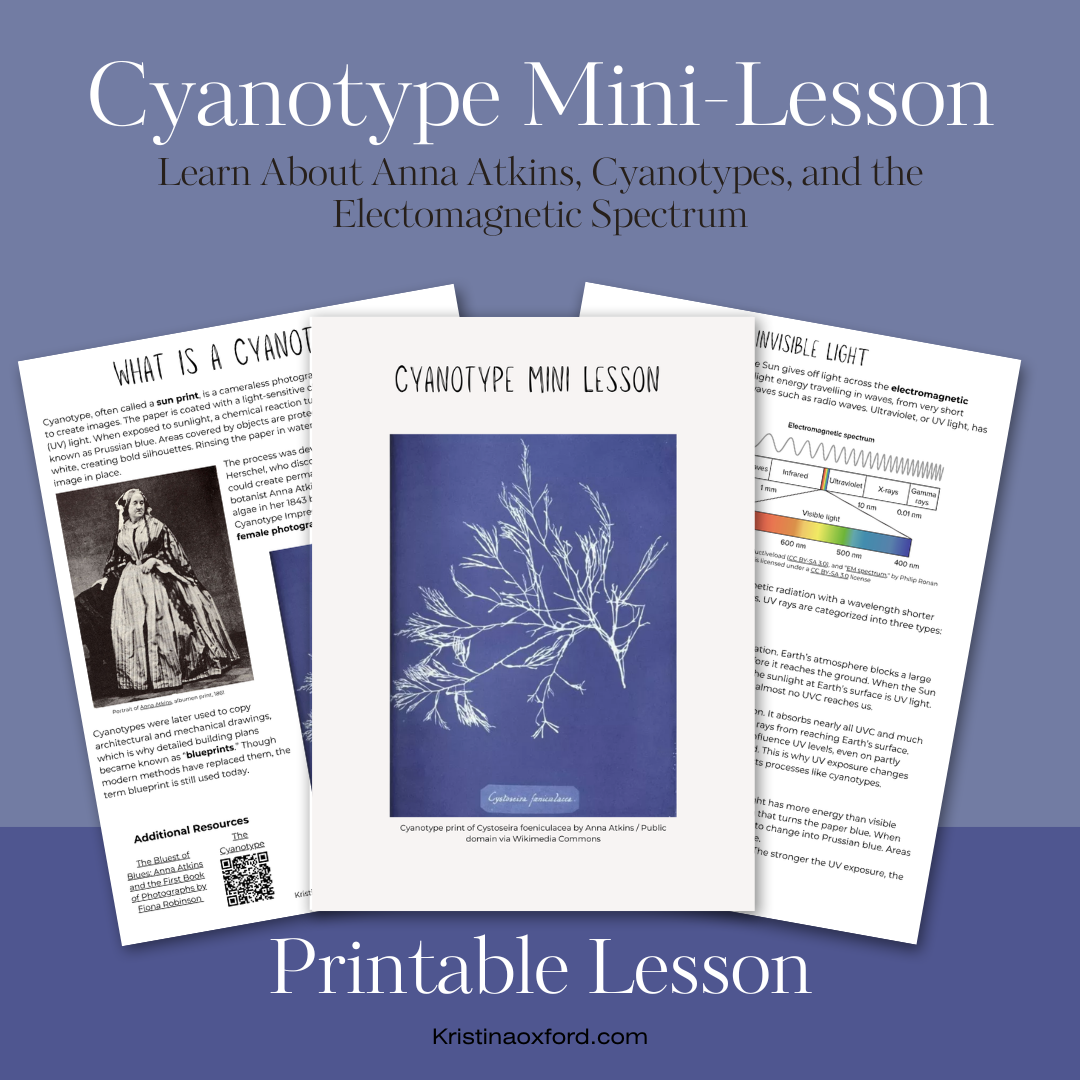 The process was developed in 1842 by Sir John Herschel, who discovered that iron salts and sunlight could produce permanent blue images. Shortly after, botanist Anna Atkins used cyanotypes to document algae in her 1843 book Photographs of British Algae: Cyanotype Impressions, becoming one of the first female photographers of the 19th century to use sunprint photography. The cyanotype blueprint became a practical way to reproduce architectural and engineering drawings.